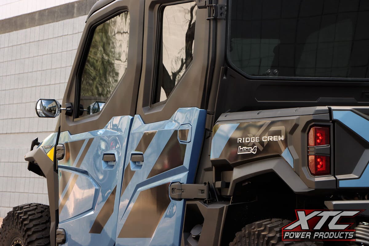 The driving lights are a custom assembly made specifically for XTC by Rigid Industries, featuring a high-output light. The Broad/Spot Optic design provides an evenly distributed light pattern that is powerful enough to be used as a standalone light while also pairing perfectly with forward-facing light bars or spotlights, ensuring optimal nighttime off-road visibility. Included in the kit is a Plug and Play wiring harness and a custom XTC Mirror Lights Rocker Switch to activate the main lights. The XTC Brushed aluminum accent plates are removable and can be powder coated for custom UTV personalization.